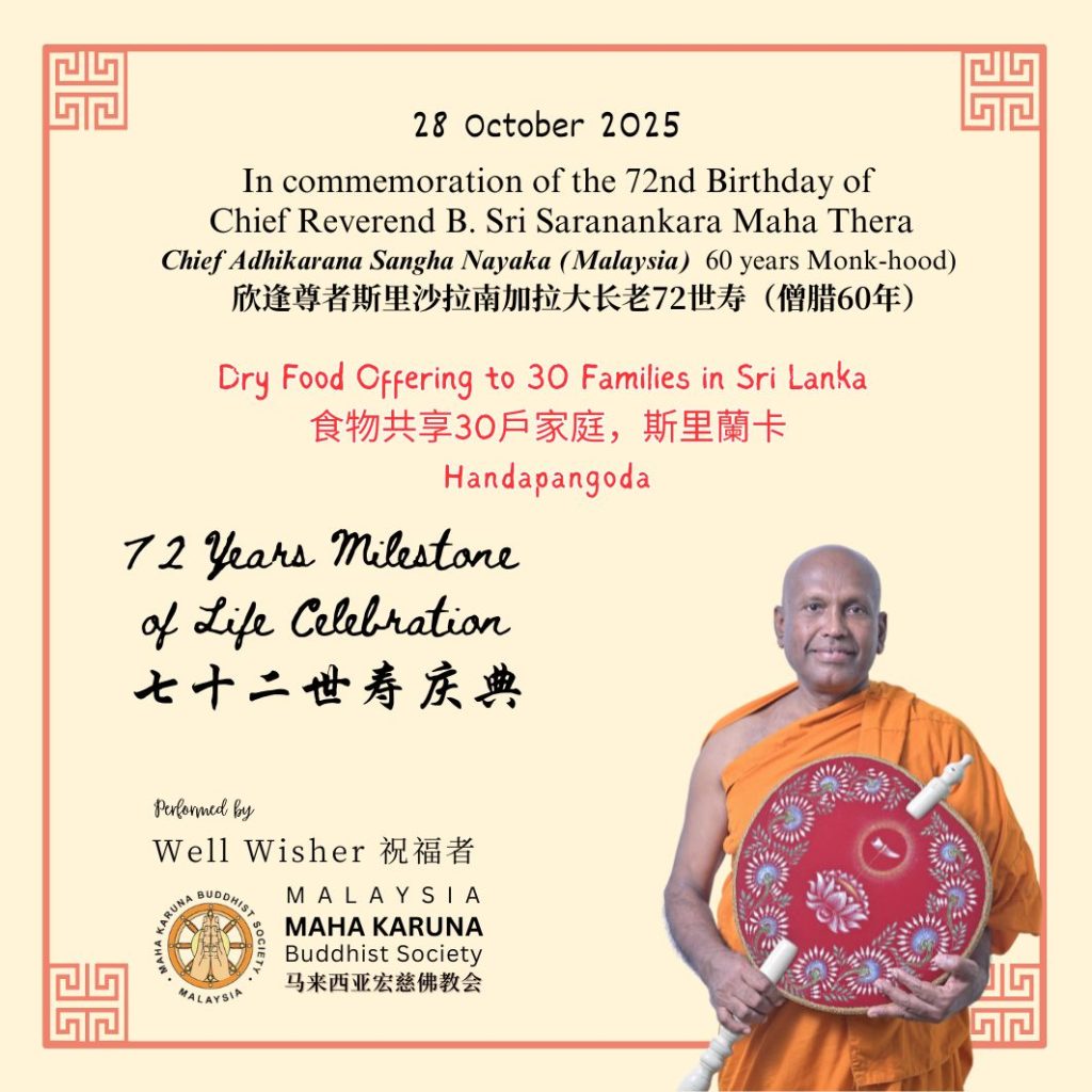 72 Years Milestone of Life Celebration In conjunction with the 72nd Birthday ofChief Reverend B. Sri Saranankara Nayaka Maha Thera(Chief Adhikarana Sangha Nayaka of Malaysia, 60 years in monkhood),Dry Food Offering to 30 Familiesin Handapangoda, Sri Lanka. May the blessings of this meritorious act bring happiness and well-being to all. May our most Venerable Teacher […]
